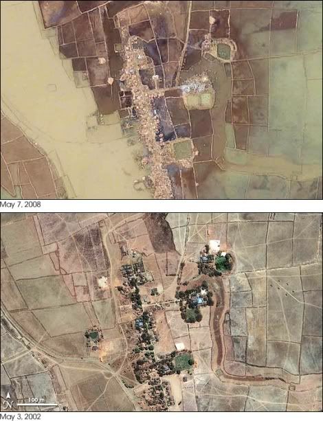 The power of destruction produced by Cyclone Nargis was so immense. Take a look at the 2 photos below. You can see that the whole village was wiped out.
