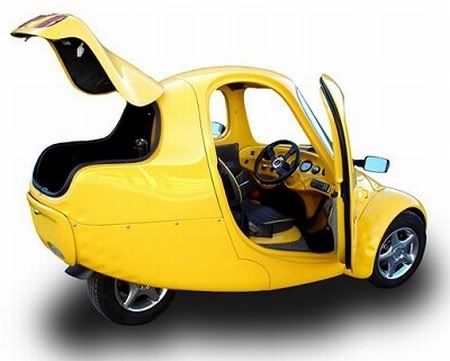 The NmG (No More Gas) car from Myers Motors is an electric car. Surprisingly, it can go up to 75 miles an hour! You can plug it into a 110 or 220 volt outlet to charge it up. It can go 30 miles after one charge. It can hold only one person and easy to park, too. The NmG will be registered and insured as a motorcycle. Price tag - $36,000. So expensive!! [Link | via Neatorama]